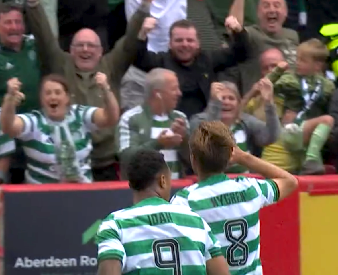 CHEERS…Benjamin Nygren celebrates with the Celtic fans at Pittodrie.
