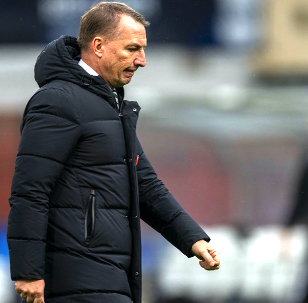 THE LONG WALK…Brendan Rodgers after Celtic’s loss to Dundee at Dens Park.