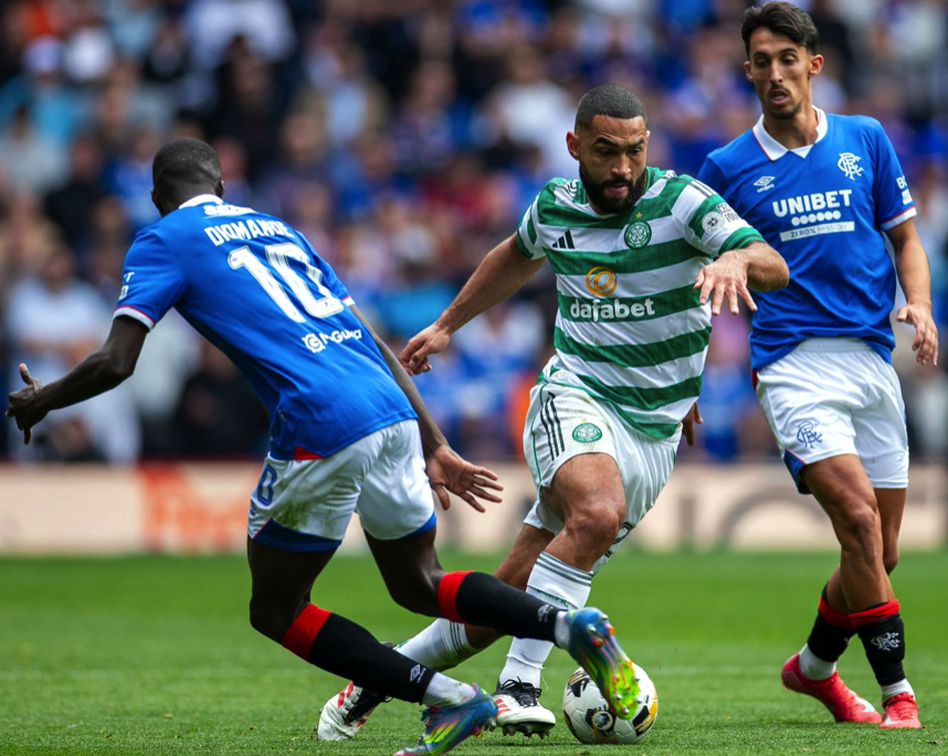 ON THE RUN…Cameron Carter-Vickers takes on Ibrox duo Mo Diomande and Bojan Miovski in the 3-1 League Cup semi-final win – now the influential defender has been sidelined.