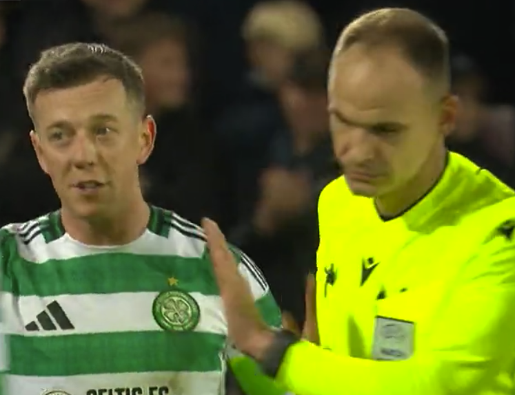HEY, REF…Callum McGregor has a protest waved away by Serbian official Nenad Minaković.