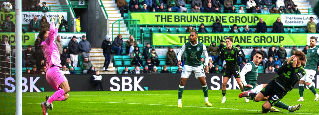 NO PAIN, NO GAIN…Arne Engels holds his head after thumping in Celtic’s second and winning goal against Hibs at Easter Road last month.
