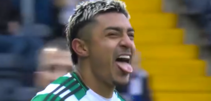 JUMPING FOR JOY…Julian Araujo acknowledges the Celtic supporters after his goal gave the champions a 3-2 win over Kilmarnock. Liam Scales and Callum McGregor look on.