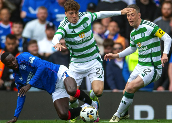 SEE YOU LATER…Arne Engels powers past Mo Diamande as Callum McGregor helps out.