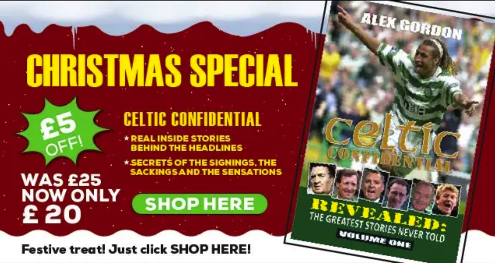 MERRY CHRISTMAS! ORDER NOW AND GET £5 OFF! Celtic Confidential is the stunning new book that brings the exclusive inside stories behind the headlines. Alex Gordon’s sixteenth Celtic book is available NOW. Order a copy and get £5 OFF the cover price of £25. All is revealed in a sensational new publication. Just click SHOP HERE and your book will be on its way. Happy Festive reading, everyone!
