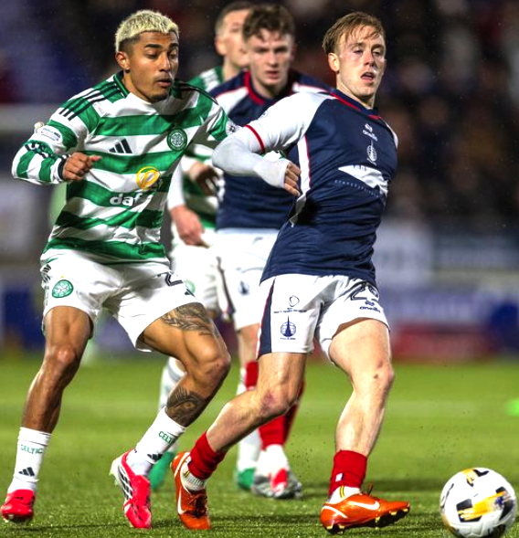 NO GO…Calvin Miller tussles for the ball with Julian Arauajo during Celtic’s 1-0 win at Falkirk last month.